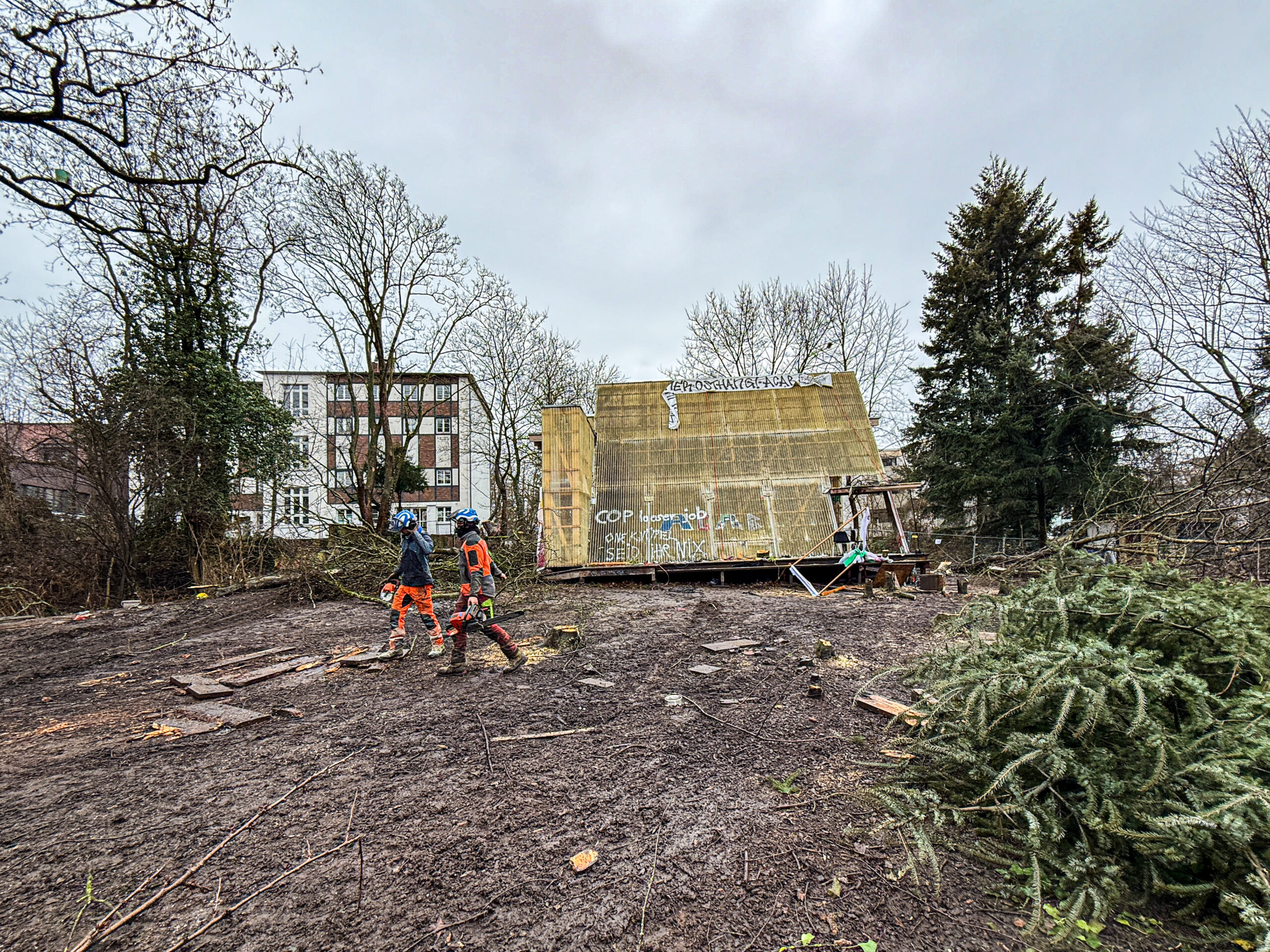 Die Situation am Osthang hat sich im Februar krass zugespitzt. Nahezu täglich landeten Pressemitteilungen von Stadt, der Initiative „Osthang bleibt“, dem OHA e. V. oder Fraktionen wie den Grünen oder Uffbasse im Postfach der P-Redaktion. Es ging um: rechtskräftiger Beschluss vs. abgekartete Machbarkeitsstudie, die leere Stadtkasse, die Sichtung eines Bergmolches oder die Frage, ob Info- oder Kulturzentrum. Der Climax der Zuspitzung dann um die Monatsmitte herum: Die Stadt teilte mit, dass nun eine Allgemeinverfügung in Kraft trete und ab Mittwoch, 18. Februar, um 6 Uhr morgens für zwei Tage ein Betretungs-, Aufenthalts- und Nutzungsverbot für das Gelände am Olbrichweg gelte. So sollte die Besetzung des Areals durch „Osthang bleibt“-Aktivisti beendet werden, die das kleine Waldstück seit Mitte Dezember Tag und Nacht blockierten, um zu verhindern, dass 13 Bäume „mit relevantem Umfang“ und fünf Vogelkirschen zur Vorbereitung der Baumaßnahmen für den Neubau eines dreistöckigen Informationszentrums gefällt werden. Und es herrschte Zeitdruck: Denn laut Paragraf 39 des Bundesnaturschutzgesetzes sind Rodungsarbeiten aufgrund der Brut- und Setzzeit vom 1. März bis zum 30. September verboten. Am Donnerstag, 19. Februar, gegen 7.30 Uhr am Morgen räumte ein Großaufgebot der Landespolizei – inklusive eines SEK-Höheninterventionsteams – im dichten Schneeregen den tags zuvor bereits eingezäunten, ehemaligen Kulturort. Die verbliebenen sechs Aktivisti wurden aus dem Gelände transportiert (die Polizei nannte es „gerettet“). Kurz nach 13 Uhr wurde mit den Rodungsarbeiten begonnen. Bei Redaktionsschluss dieser Ausgabe waren die vorab ausgewählten 13 Bäume gefällt und der Abbau der OHA-Main-Hall, der in die Weststadt vor das Kunstdepot umziehen soll, wurde vorbereitet. Tabula rasa. osthang.de/ohablog