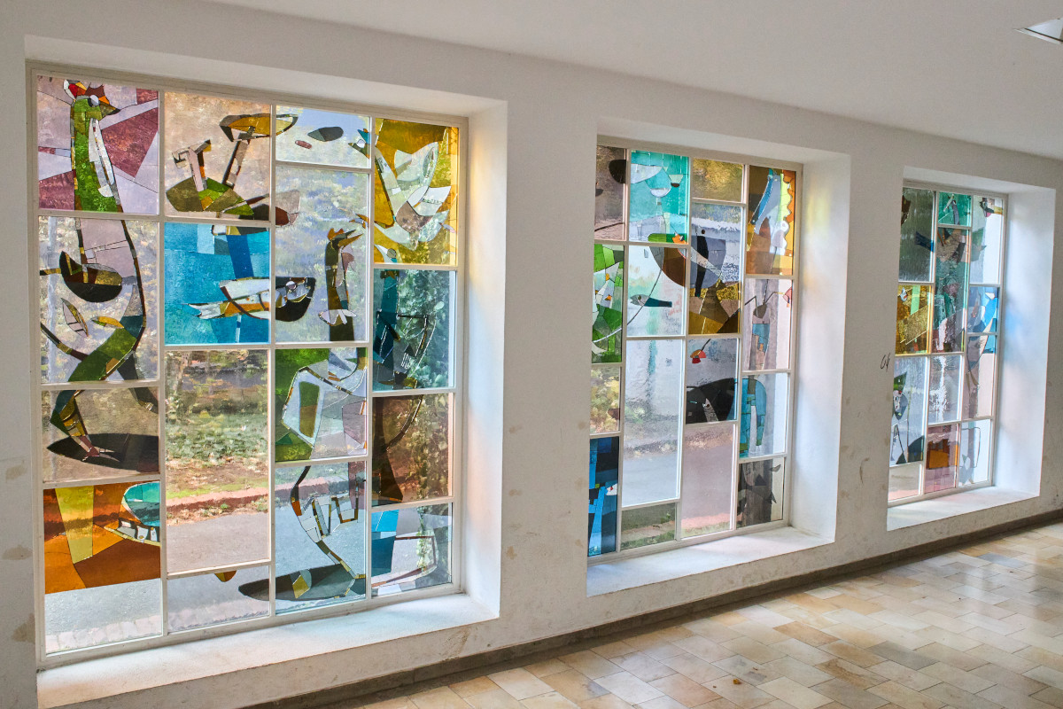 Tagsüber geht man vielleicht achtlos vorbei, denn dieses von Helmut Lander gestaltete Fenster zeigt sich bei Tageslicht nur zurückhaltend. In seiner Struktur gliedert es sich in Felder verschiedener Dimensionen: einige offen und weit, die den Blick auf den Außenraum durchlassen, andere dichter, gefüllt mit Tiergestalten, deren Linien und Flächen das Licht brechen.